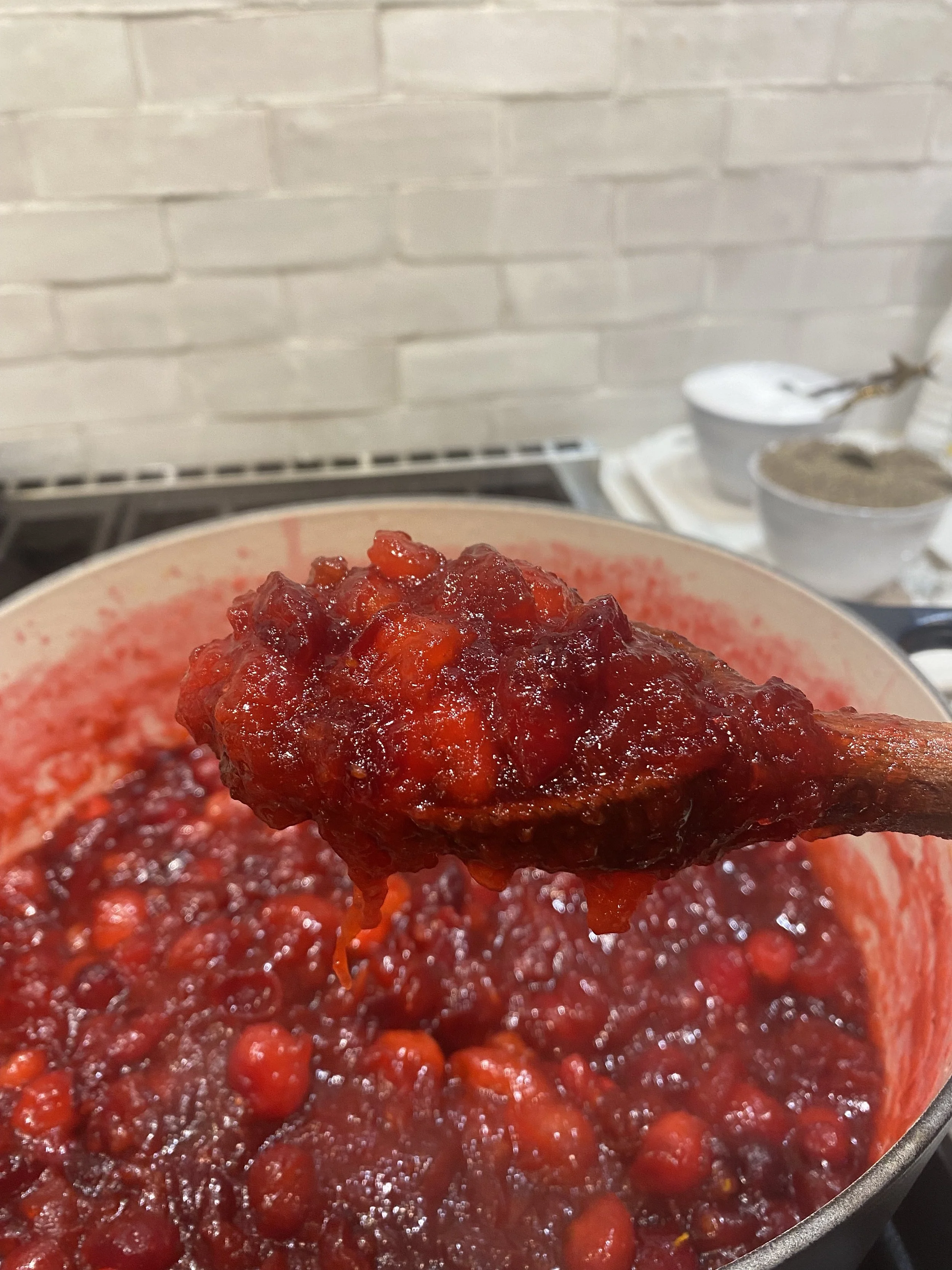 Turn heat off and add the cinnamon stick. Stir sauce. The sauce will be thick and about ⅔ of the cranberries will have broken down and a dark ruby color will develop.